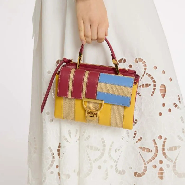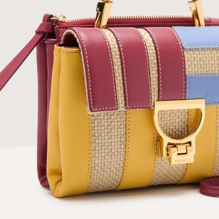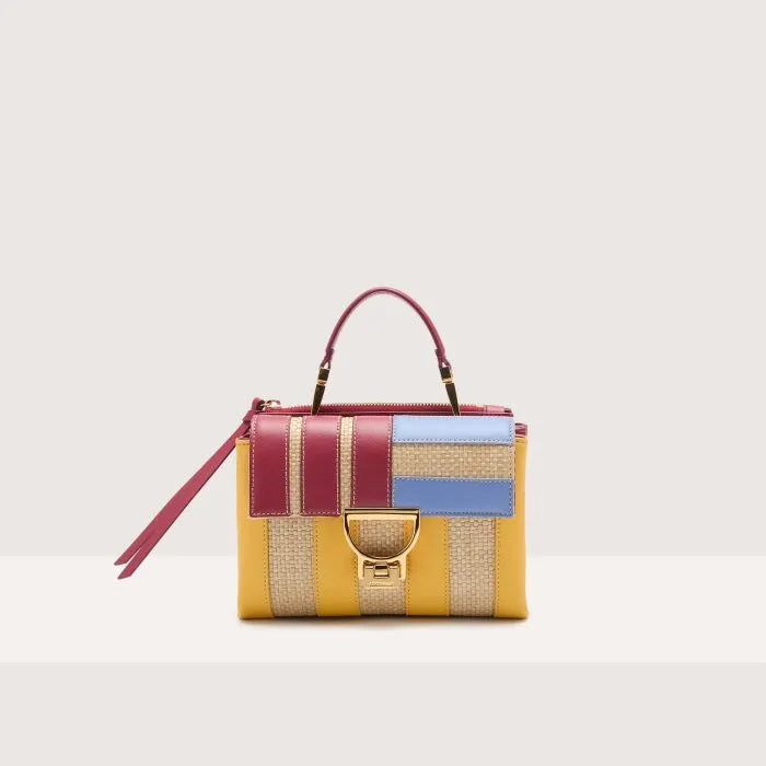 La borsa Arlettis è composta da due scomparti: uno posteriore con zip e uno anteriore caratterizzato dall'iconica chiusura in metallo. Versatile per un uso quotidiano, può essere indossata sia a mano, grazie al manico removibile, che a bandoliera o a spalla grazie alla tracolla regolabile. Questo modello è realizzato in strisce di pelle liscia di diverse dimensioni applicate in verticale ed orizzontale su base paglia.