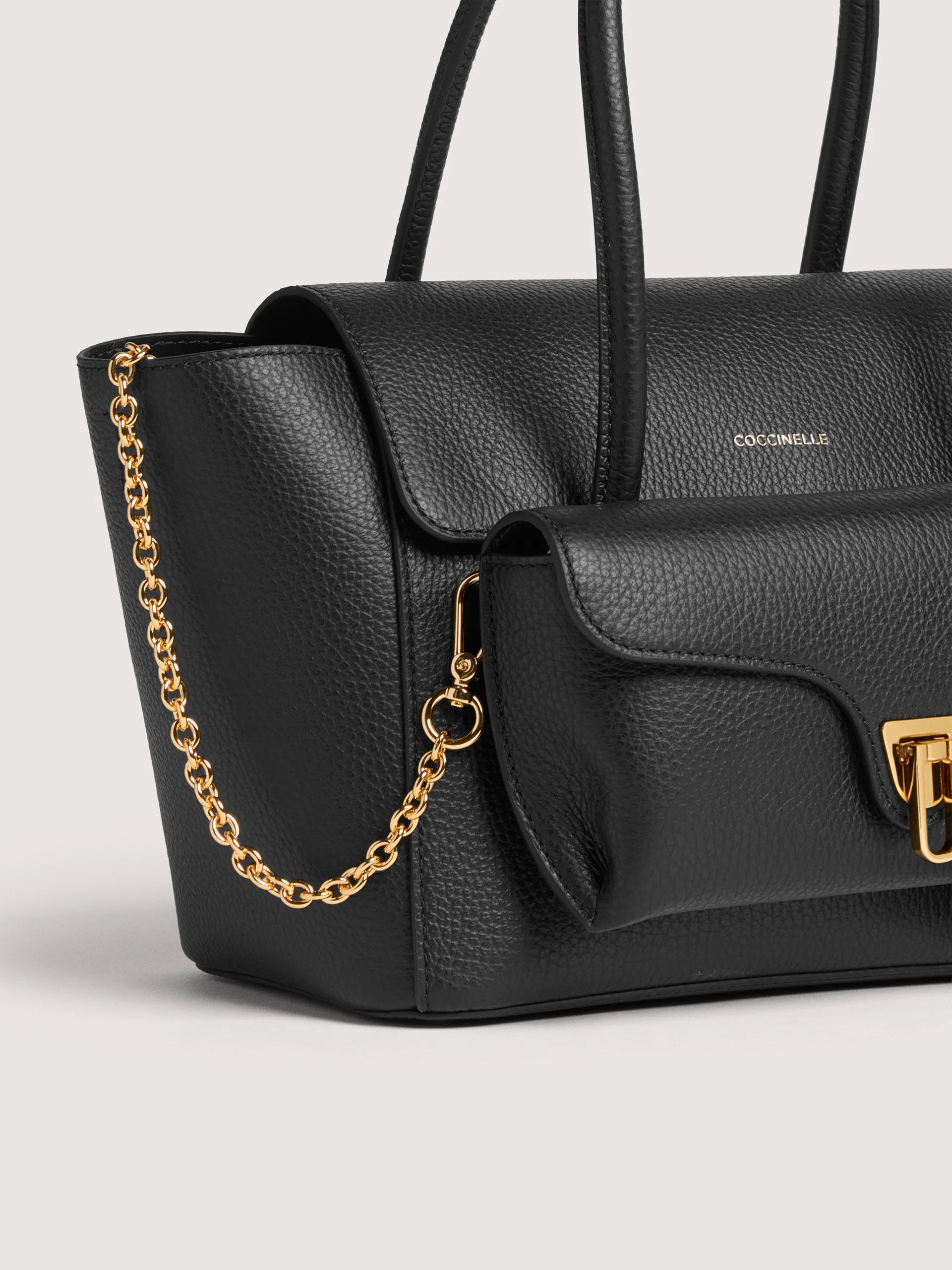 Coccinelle Double Beat è una vera daily companion, una borsa capiente con patta, da indossare a spalla o crossbody, grazie ai manici tubolari o alla comoda tracolla regolabile. Grazie ad un innovativo funzionamento, la tasca frontale è staccabile e si trasforma all’occorrenza in pouch portatutto o in elegante clutch da indossare per le occasioni più speciali. La tasca, infine, è anche simbolo di identità Coccinelle grazie all'iconico dettaglio plettro. Questo modello è realizzato in pelle lavorata tramite specifici macchinari e poi bottalata al fine di mantenerne la morbidezza. È una pelle molto resistente che si presta a una facile pulizia, ideale per un uso quotidiano.