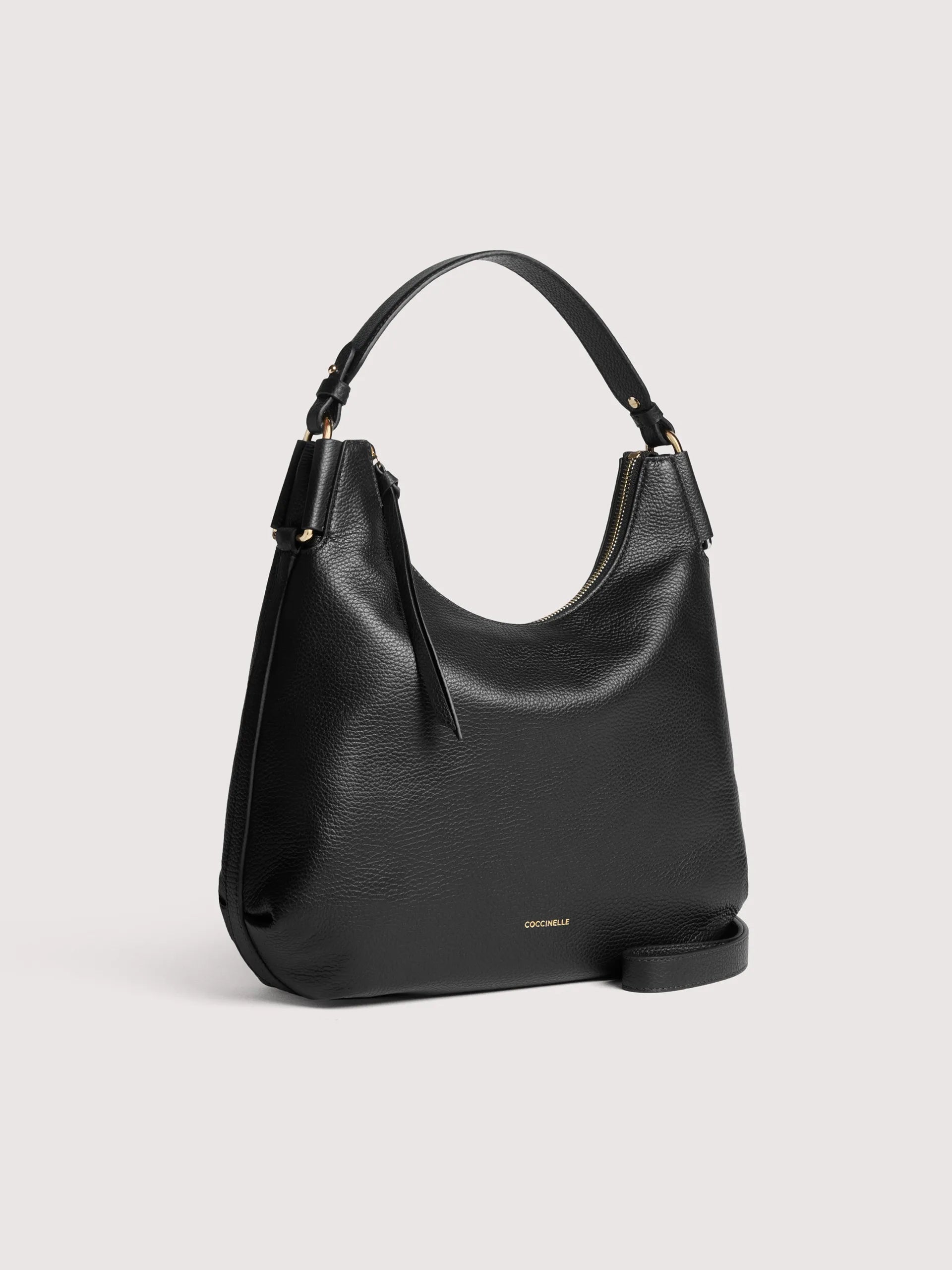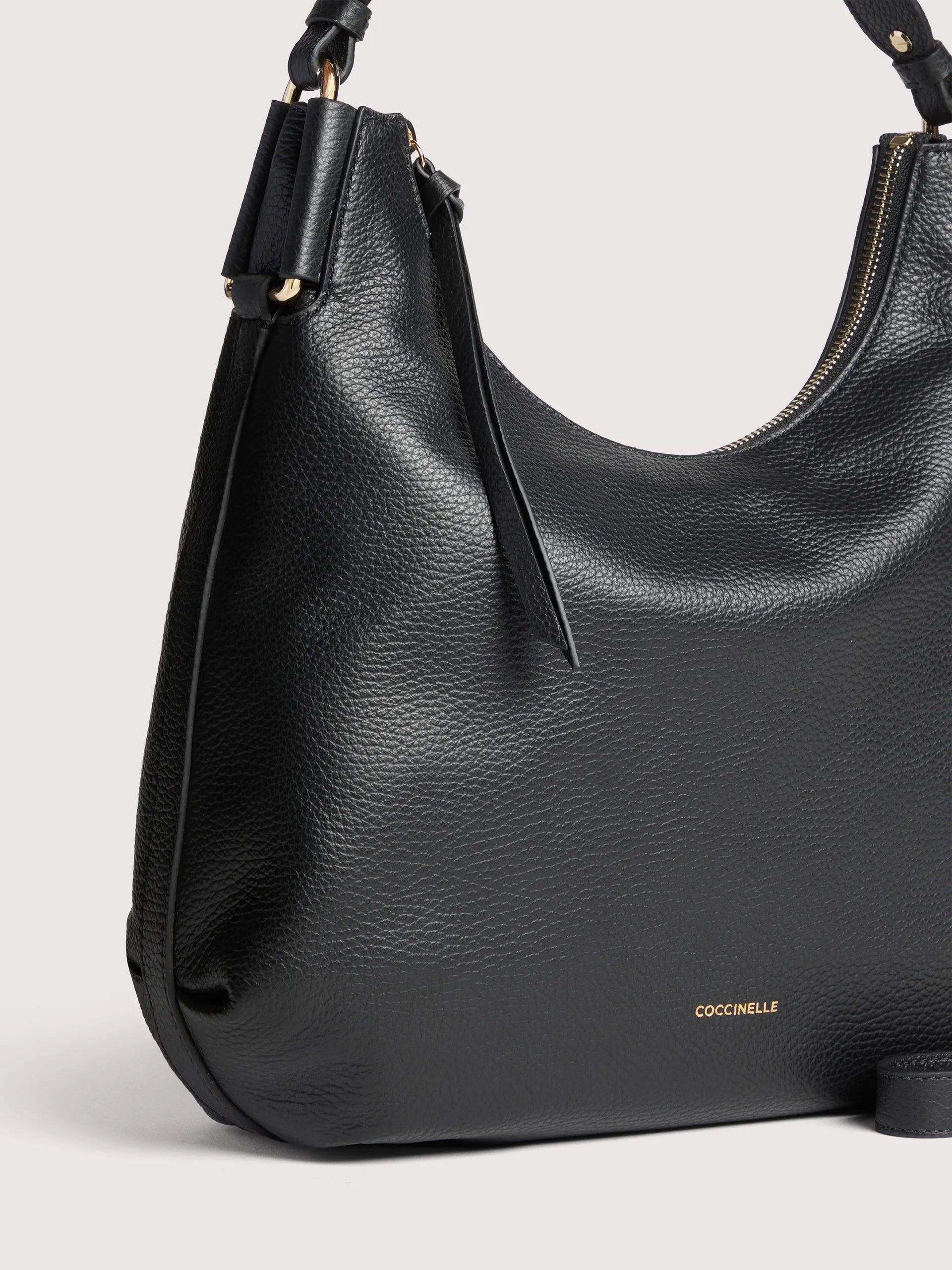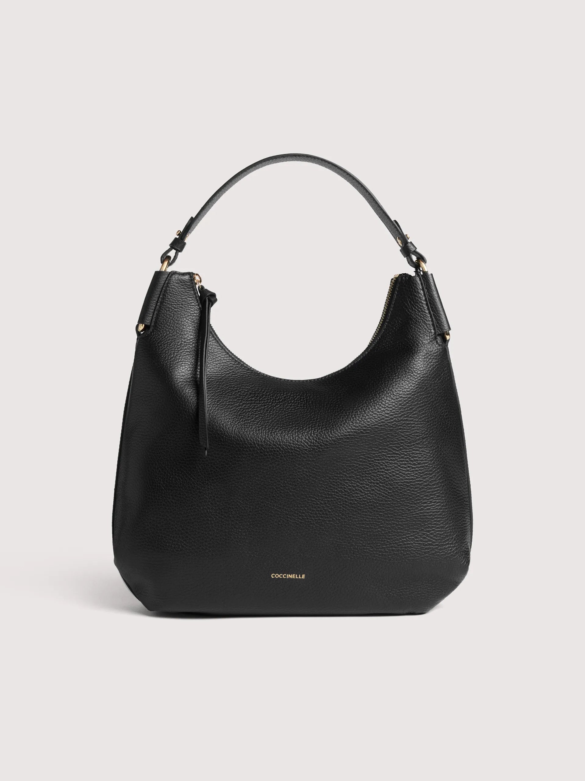 L'estetica della linea Coccinelle Rebekka racconta di un armonico equilibrio tra eleganza e funzionalità. Borse capienti e leggere dalla silhouette tondeggiante e dalla costruzione ricercata che esalta la morbidezza del materiale. Non manca il dettaglio d’identità che troviamo nel maxi plettro laterale che funge da attacco tracolla. Ogni modello è caratterizzato da una pratica e sicura chiusura con zip, perfetta per accompagnare la donna nella sua quotidianità. Questo modello è realizzato in pelle lavorata tramite specifici macchinari e poi bottalata al fine di mantenerne la morbidezza. È una pelle molto resistente che si presta a una facile pulizia, ideale per un uso quotidiano