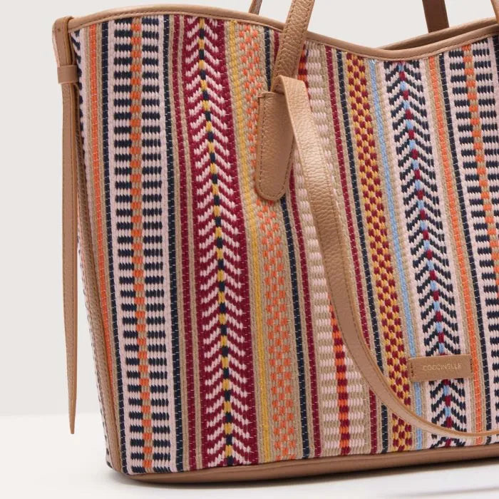 La new Never Without Bag è una shopping in perfetto stile cosmopolita, capace di accompagnare la donna Coccinelle lungo tutta la sua giornata. Un modello dalla silhouette essenziale e femminile, addolcito dalla morbidezza delle curve. Da indossare a spalla o a mano grazie alla doppia portabilità, inoltre i nastri laterali in pelle donano eleganza e femminilità alla borsa. Questo modello è realizzato in Tessuto realizzato con macchine che utilizzano la classica tecnica per la realizzazione dei tappeti, attraverso filati di grosso titolo e mediante programmi in grado di realizzare un disegno specifico. L’effetto finale è un tessuto ricco e dal motivo multicolore.