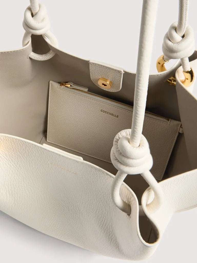 Coccinelle Finn combina struttura e morbidezza. Pelle e metallo lavorano in armonia creando un design raffinato; i manici tubolari impreziositi dall’elegante dettaglio tondeggiante in metallo si annodano e si infilano nei quadranti creando delle pieghe; il risultato è una silhouette femminile e al tempo stesso moderna. Questo modello è realizzato in pelle lavorata tramite specifici macchinari e poi bottalata al fine di mantenerne la morbidezza. È una pelle molto resistente che si presta a una facile pulizia, ideale per un uso quotidiano.