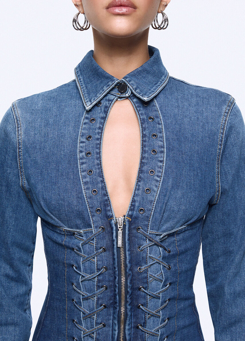 Linee aderenti, dettagli lace-up e costruzione bustier. Questo abito corto in denim della collezione Liu Jo feat. Elodie disegna una femminilità sensuale e contemporanea, impossibile da dimenticare.