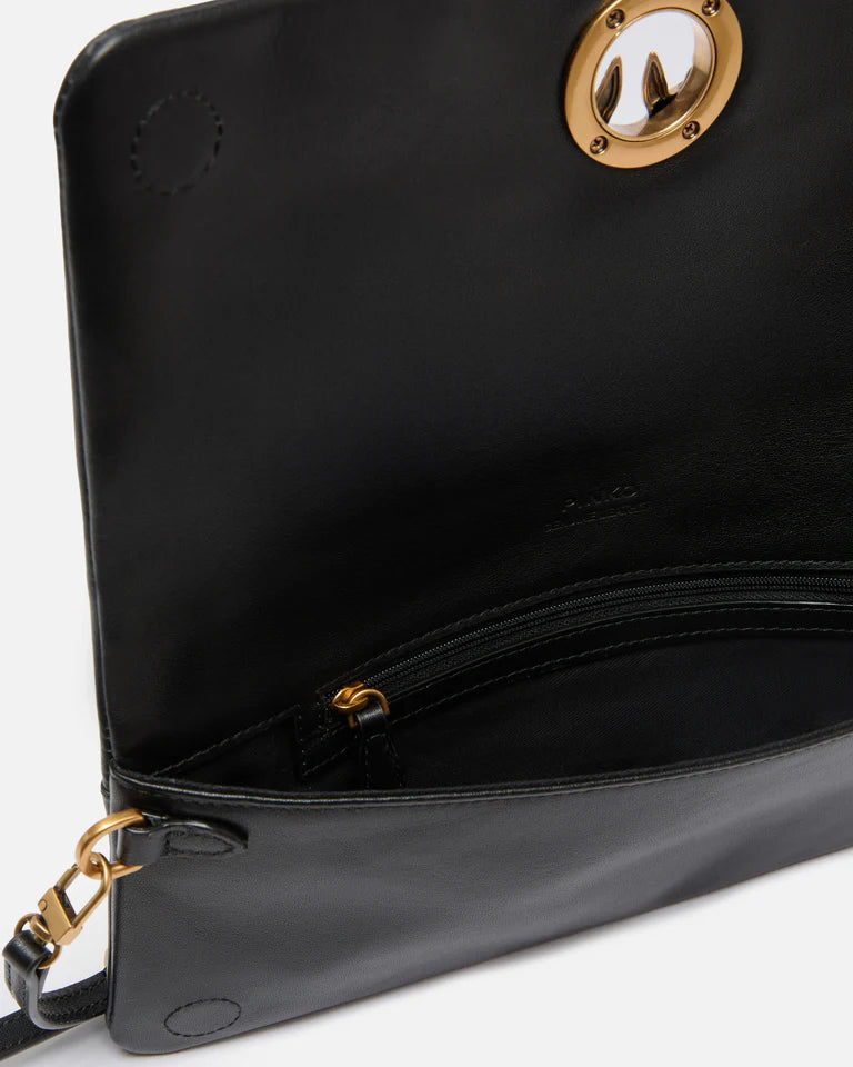 Pochette Love Bag Click Soft Horizontal di medie dimensioni dal design piatto e dalla forma rettangolare, realizzata in morbida pelle. La borsetta, imbottita e personalizzata dall'iconico logo metallico Love Birds Diamond Cut sul davanti, può essere indossata a spalla, crossbody oppure a mano grazie alla tracolla in pelle rimovibile, decorata da anellini in metallo che formano il logo lettering PINKO. La chiusura con due bottoni interni a calamita rivela un interno foderato in drill di cotone con tasca a parete chiusa da zip. Attiva la tua borsa PINKO: verifica l'autenticità del tuo prodotto e accedi all'esperienza personalizzata avvicinando il tuo smartphone al ricamo Love Birds che trovi sul retro della borsa! - CLICK SOFT HORIZONTAL CLASSIC