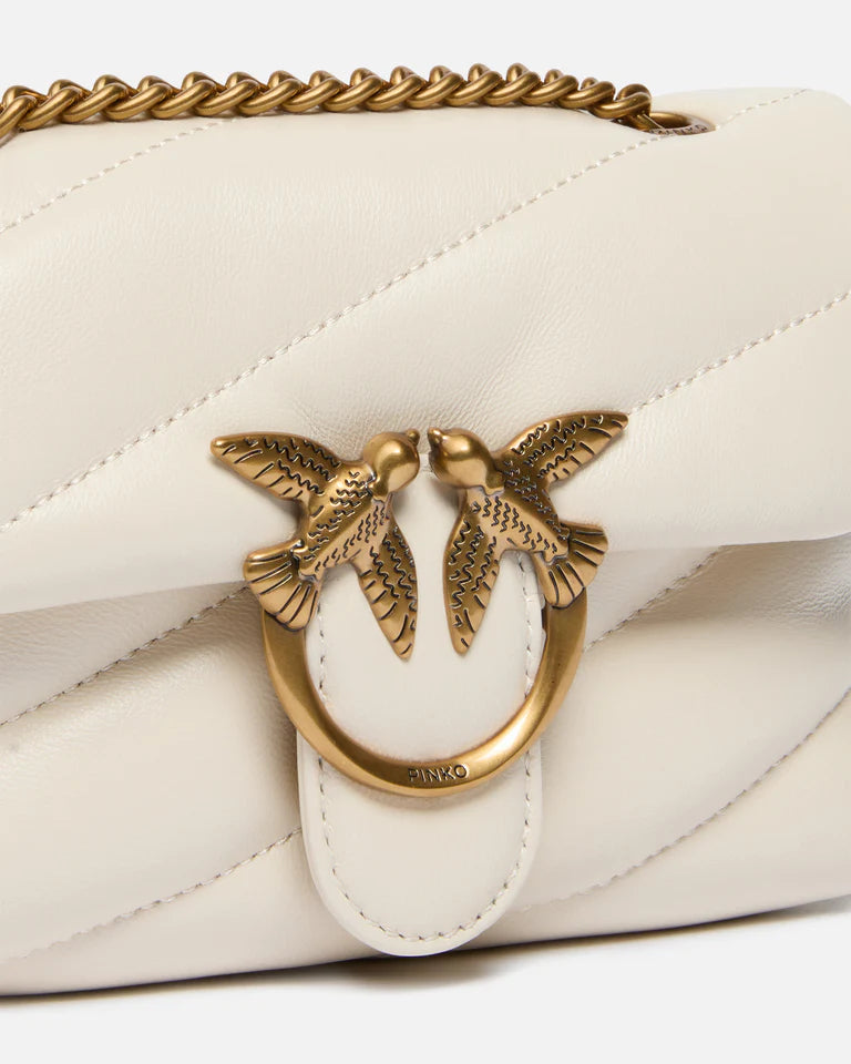 Baby Love Bag Puff in morbida nappa con maxi trapuntatura obliqua. La chiusura è completata dall'iconica fibbia in metallo Love Birds Diamond Cut. L'interno è foderato in microfibra scamosciata e comprende tasca a parete chiusa con zip. Completa di tracolla sottile a catena in metallo. - LOVE BABY PUFF C