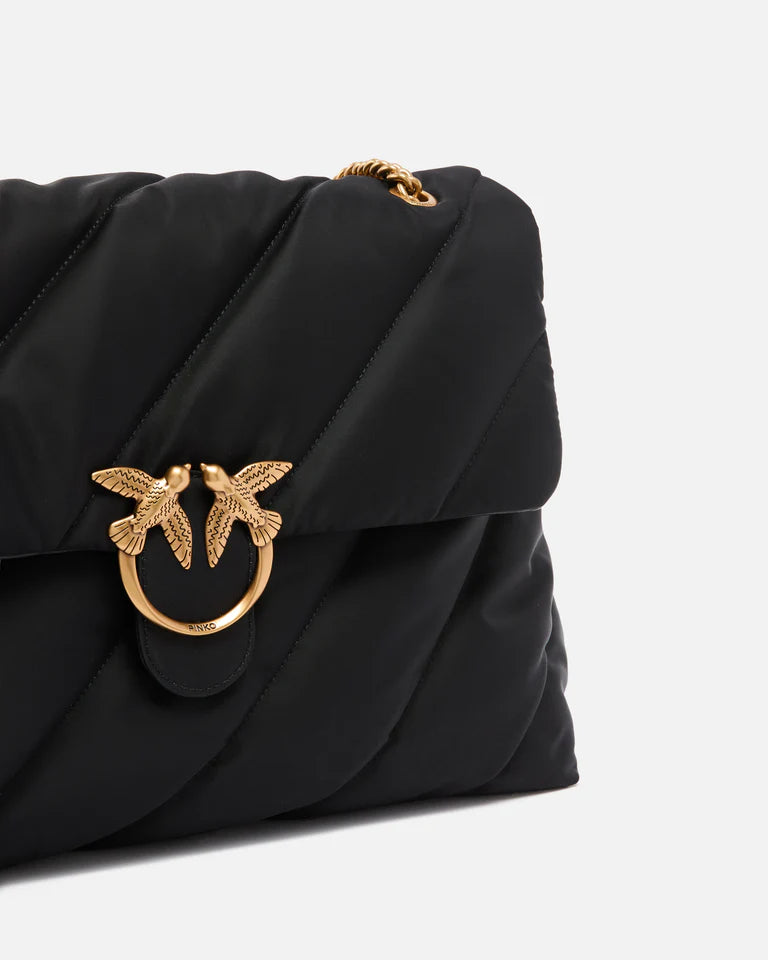 Borsa grande Love Bag Puff dalla forma leggermente a trapezio e dal design piatto, realizzata in morbido nylon con maxi trapuntatura obliqua. Il modello include una tracolla a catena con filo tondo e spallaccio effetto pelle, che permette di ottenere tre diverse opzioni di portabilità: crossbody, a spalla oppure a mano. Contemporaneo e raffinato, l'accessorio è personalizzato inoltre dalla fibbia Love Birds Diamond Cut sulla chiusura a baccello, portavoce dell'inimitabile stile PINKO, ed è dotato di un interno foderato in tessuto tecnico con tasca a parete completa di zip. Attiva la tua borsa PINKO: verifica l'autenticità del tuo prodotto e accedi all'esperienza personalizzata avvicinando il tuo smartphone al ricamo Love Birds che trovi sul retro della borsa!