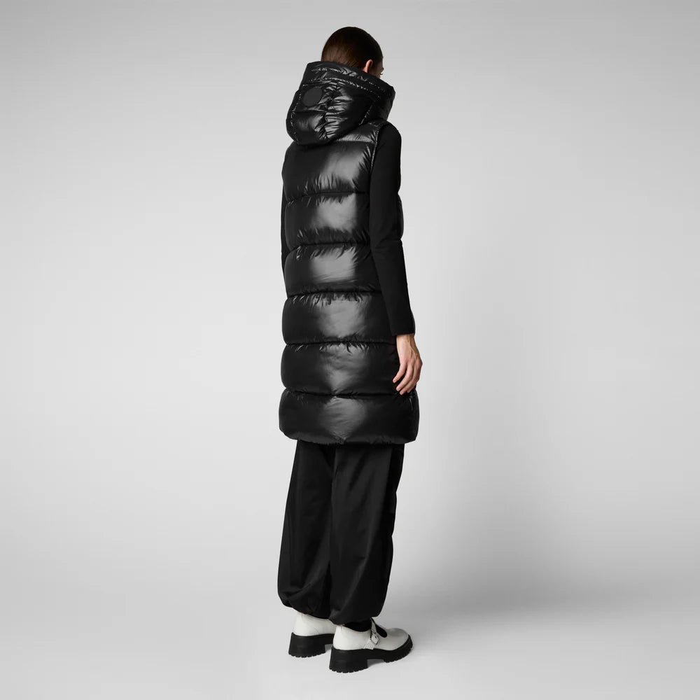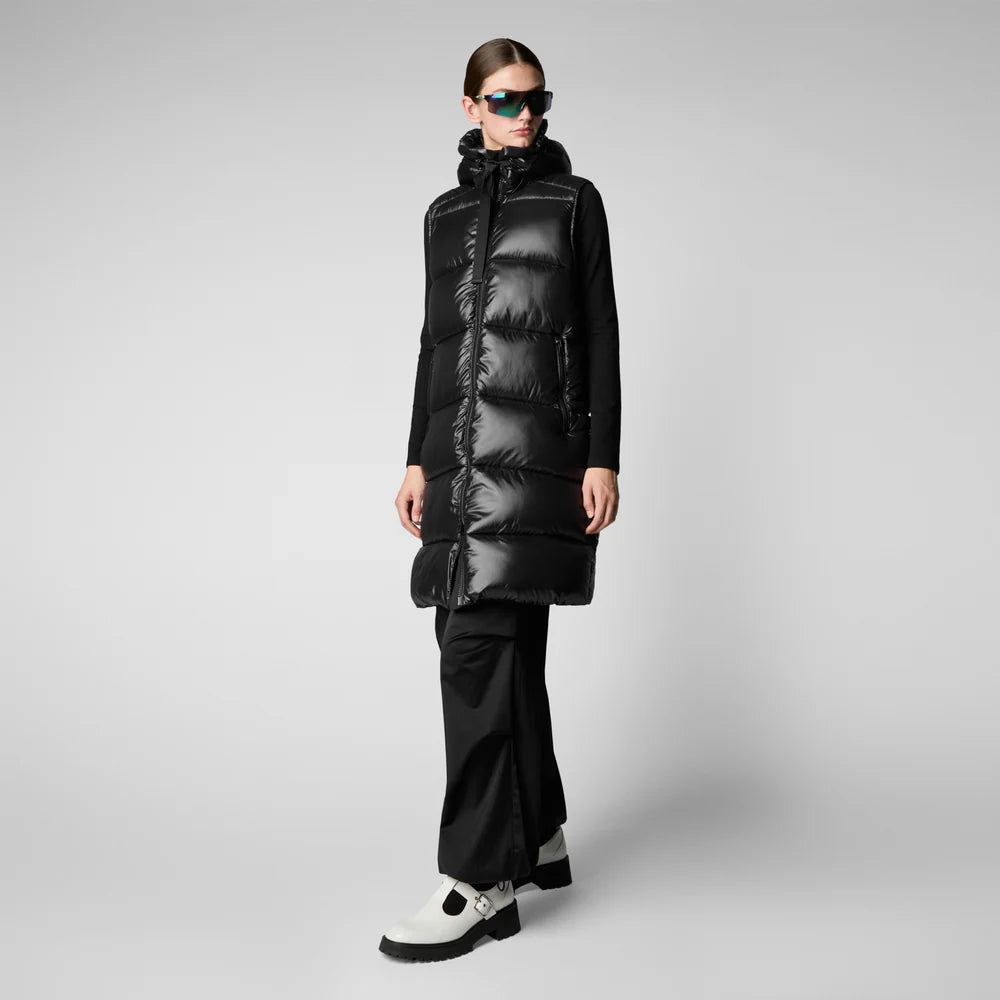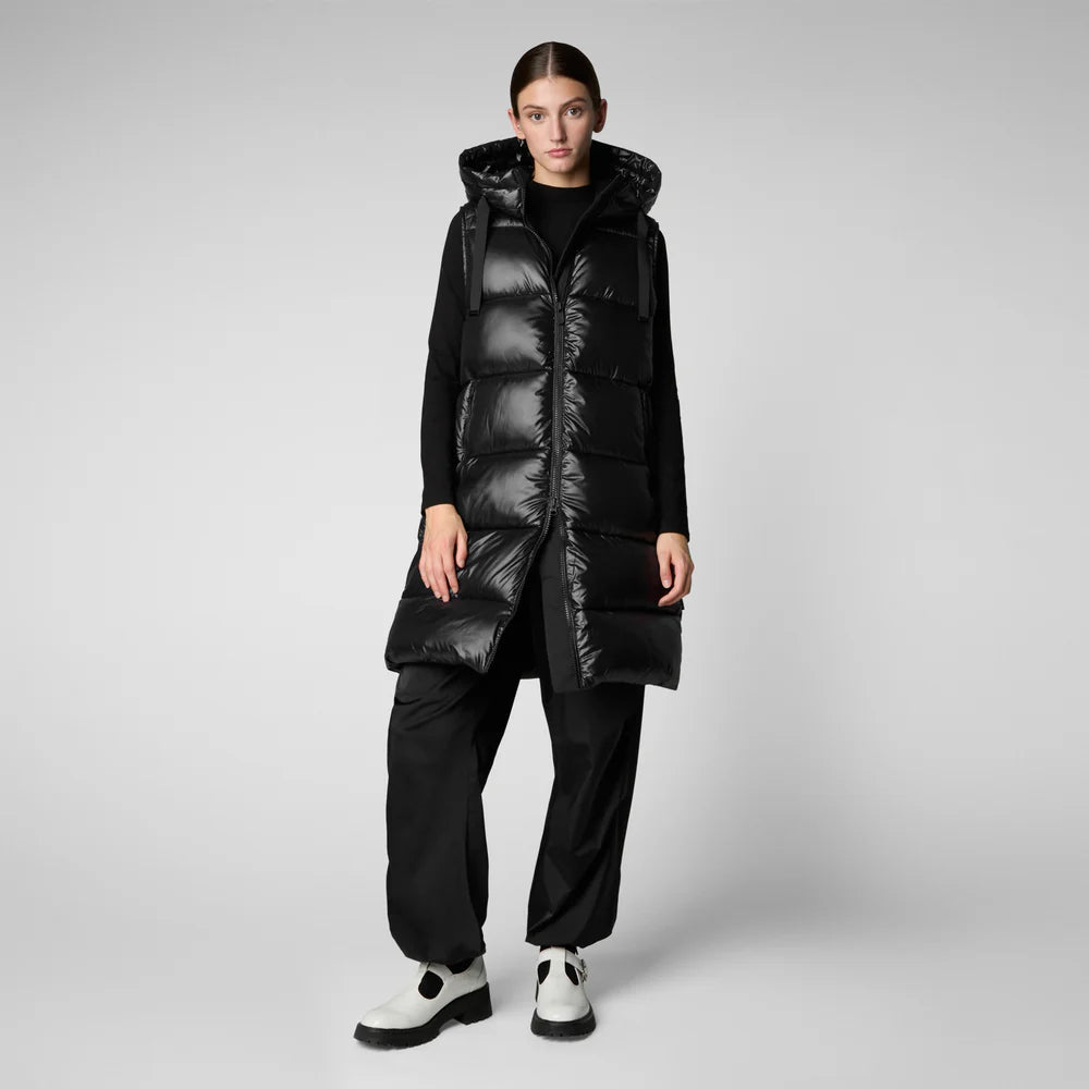 Ideale per la mezza stagione, ma anche indossato sopra i cappotti, per gli inverni pi� rigidi, Iria � un gilet imbottito e trapuntato definito da una lunga linea ad A. Contro vento e umidit� il modello schiera un ampio cappuccio regolabile con un nastro grosgrain. Il tiretto personalizzato e il logo nero applicato sul fondo completano lo smanicato in perfetto stile Save The Duck